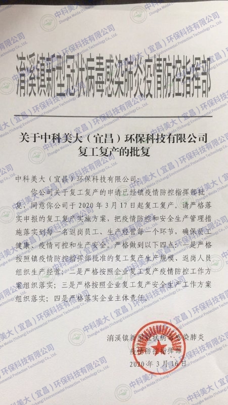集團(tuán)子公司中科美大(宜昌)環(huán)??萍加邢薰倦m地處湖北,受疫情影響較重,但在各級黨委政府采取有力防疫措施后,當(dāng)前疫情得到極大的控制,湖北省當(dāng)陽市已被劃分為低風(fēng)險地區(qū)。公司積極響應(yīng)政府關(guān)于復(fù)工復(fù)產(chǎn)的政策指導(dǎo),已獲得淯溪鎮(zhèn)疫情防疫指揮部準(zhǔn)予復(fù)工復(fù)產(chǎn)的批復(fù),并于2020年3月17日正式復(fù)產(chǎn)復(fù)工!